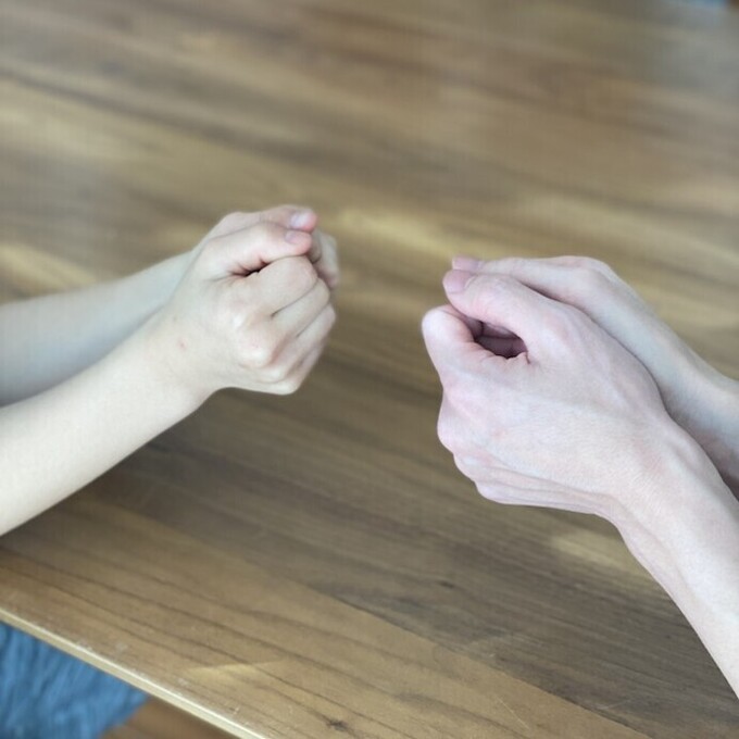 参加者全員が輪になり、手錠をかけられるような形で(親指が上に来るように)両手に拳を作ったら準備OK!いよいよ、指スマのスタートです。