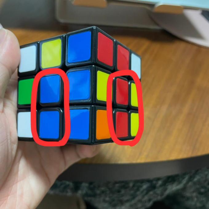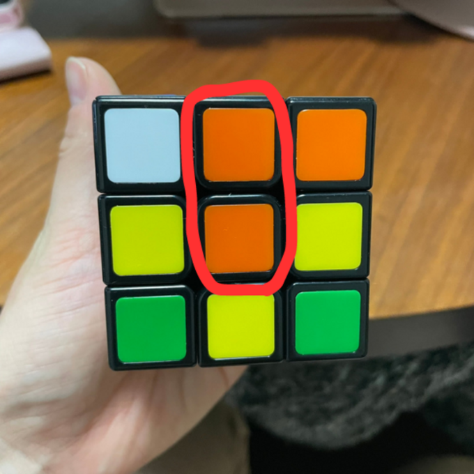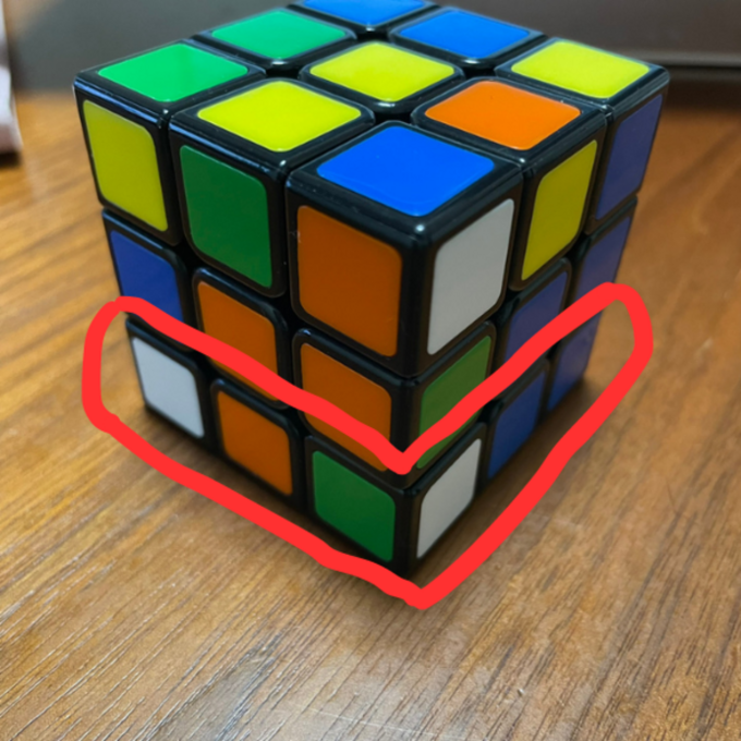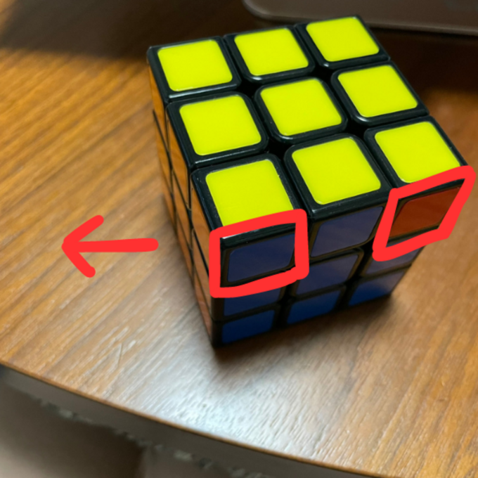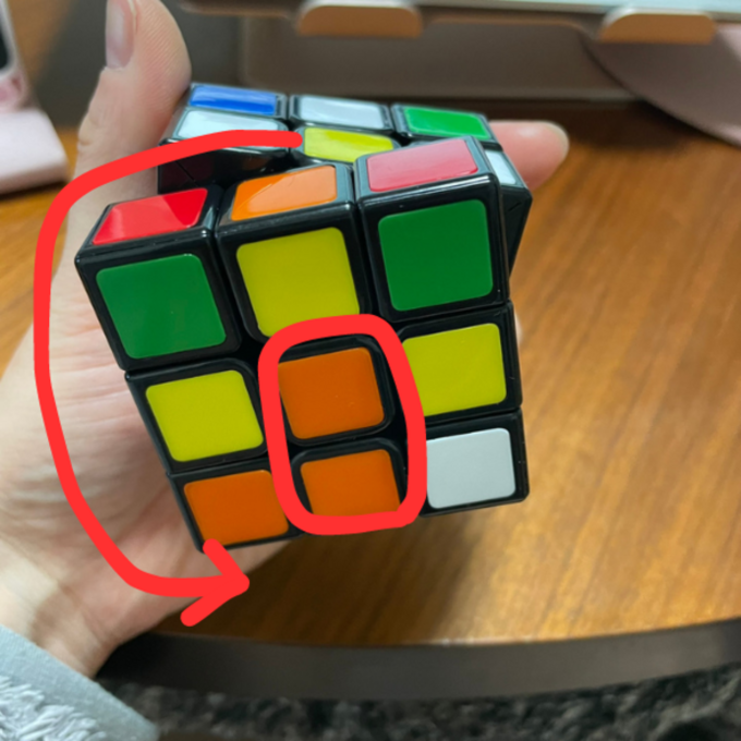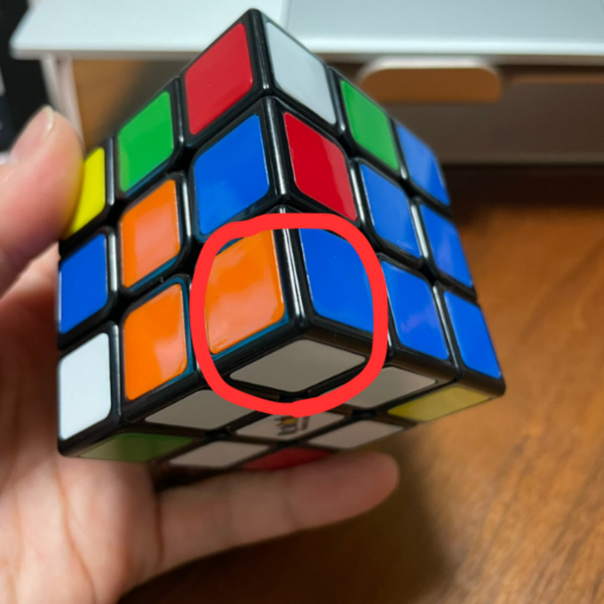 次は先ほど十字がそろった白面とその側面(写真で囲った部分)の色をすべてそろえていきます。まずは黄色センター面を上にして持ち、上から1段目の角に白色がある部分を探します。