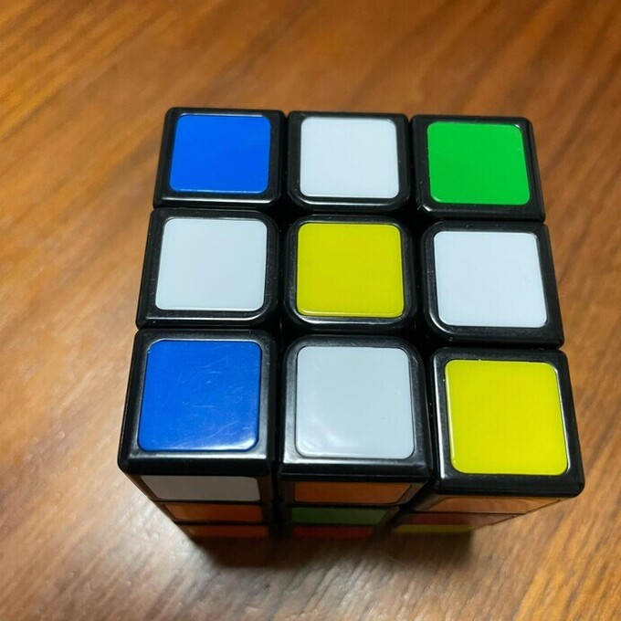 まずは青×橙×白の角が右側に来るように手に持って、(左、上、右、下)の順に回します。先ほどの白×青×橙が底面に白がくるまで何度も回します。