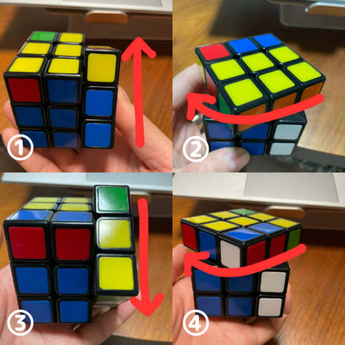 次は黄色を上にしたときに、1段目の両角の色が同じになるようにします。すでにペアになっている面がある場合はその面を左に向けて、左の面を上+逆セクシー(左、上、右、下)+左の面を下で回します。