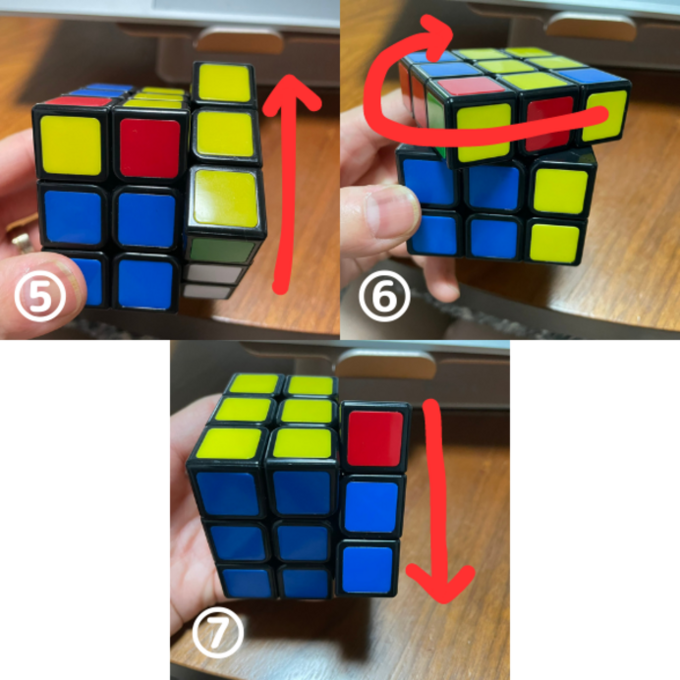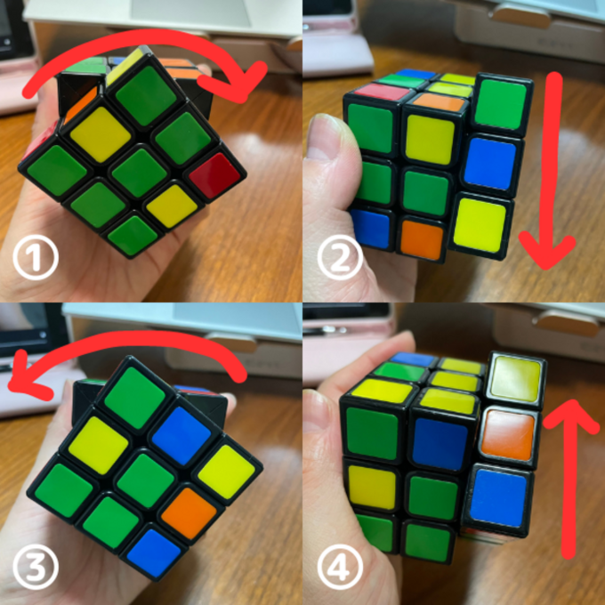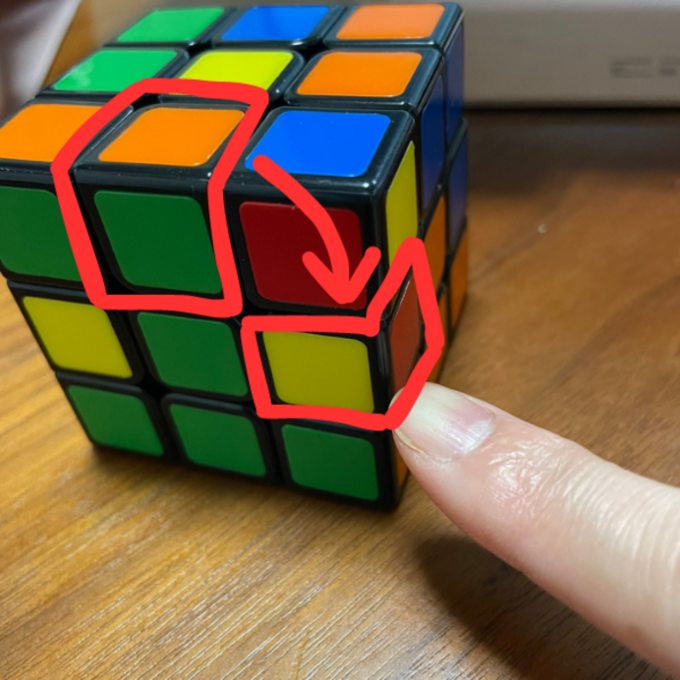 この橙×緑の角を、指差ししている右側の角にもっていくために今回も逆セクシーを使いますが、逆セクシー(左、上、右、下)を回した後にさらに写真の手順(右、下、左、上)も追加します。