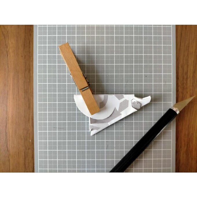 まず、折る回数が多くて厚みもあり、かたいです。特に目の部分は小さな円に切り取るのですが、一番下まで簡単にはナイフの刃が通りません。