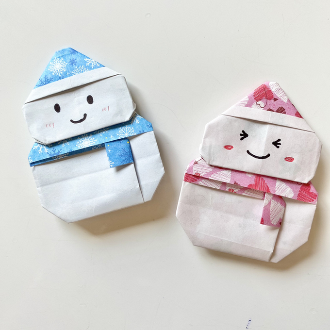折り紙1枚で完成するマフラーと帽子をつけたかわいい雪だるまです。