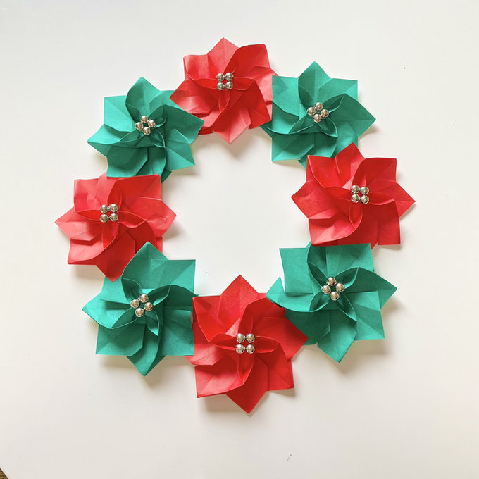 クリスマスの折り紙:ポインセチアのリース