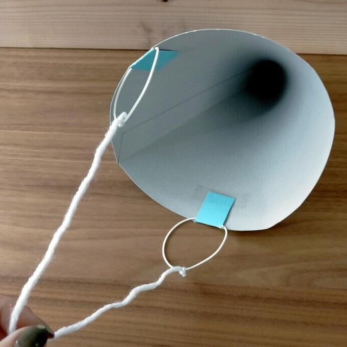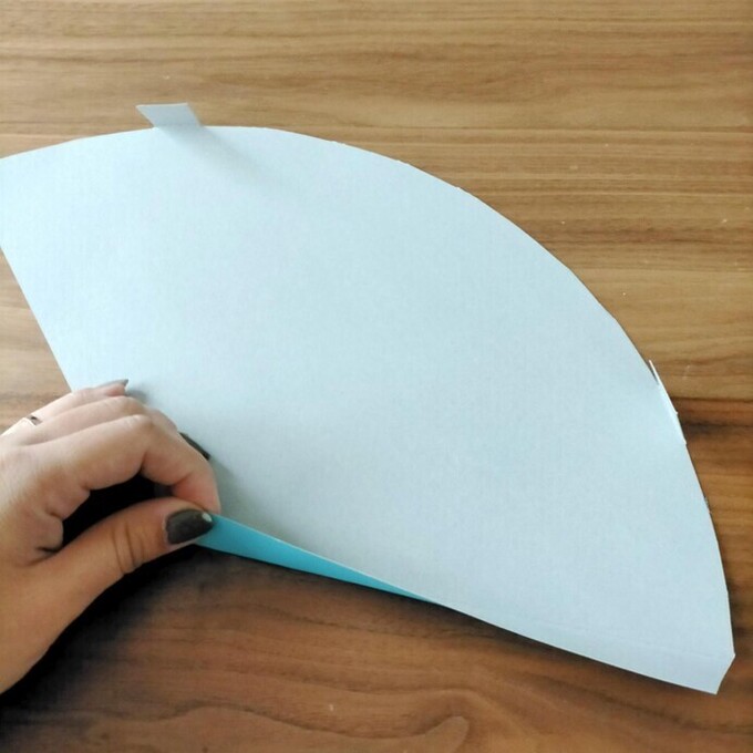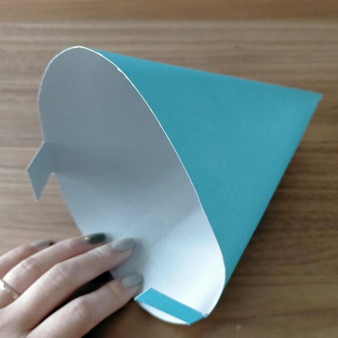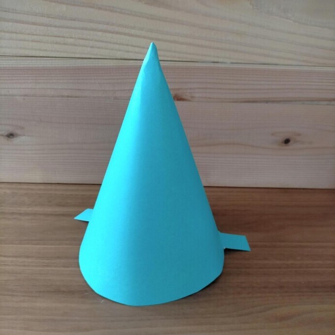 のりしろにのりや両面テープを付け、円錐形になるよう全体を丸めて固定します。