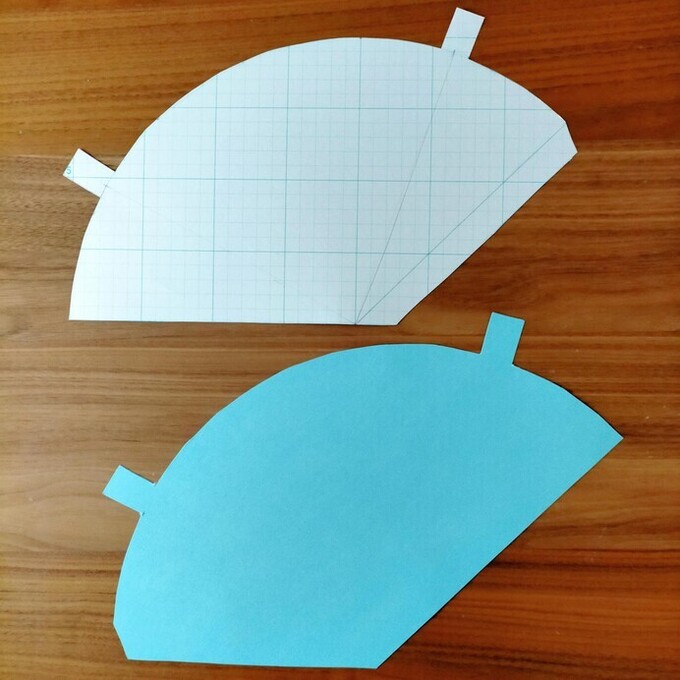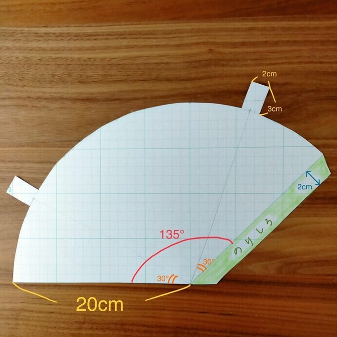 まずは、画用紙や厚紙等で型紙を作ります。サイズの目安として、今回は半径20cm、内角135°にしました。このサイズなら、大人も子どももかぶれる三角帽子に仕上がります。