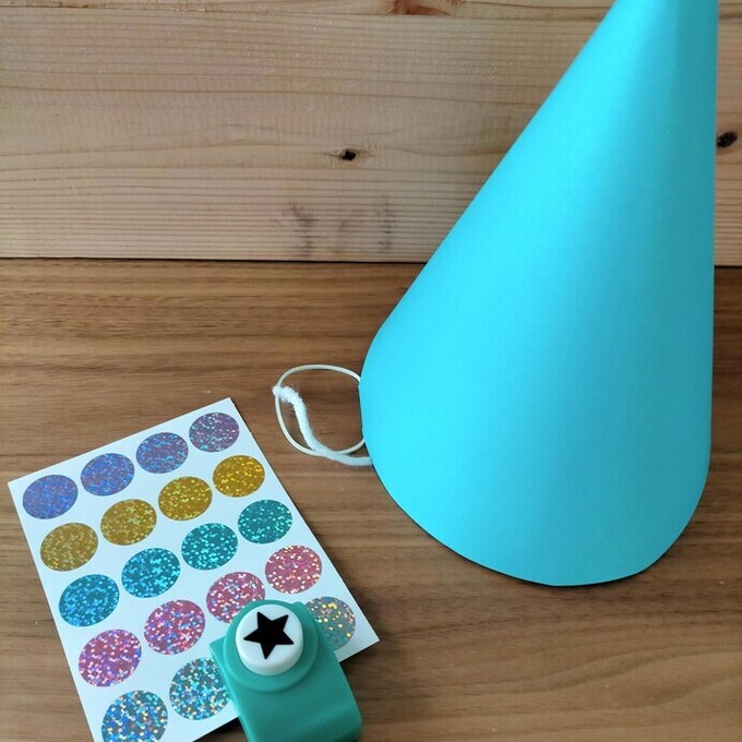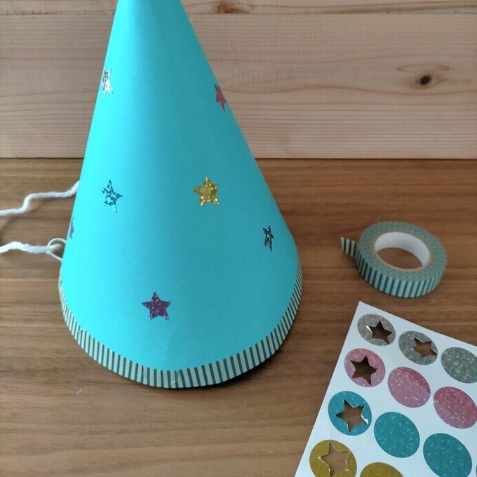 シールやマスキングテープ、折り紙などを使って三角帽子のベースをかわいく飾り付けましょう♪今回はクリスマスっぽい雰囲気にするために、星型のクラフトパンチでシールをくり抜いてみました。
