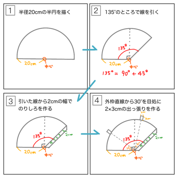 まずは①のように、半径20cmの半円を描きます。定規で作る場合は、中心から20cmの位置にいくつか点を打っていきます。