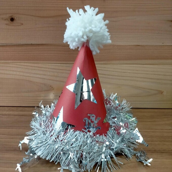 こちらはにぎやかな飾り付けに☆帽子の頂点には毛糸で作ったポンポンを付け、シルバーのキラキラしたモールやセロファンで全体を装飾しました。