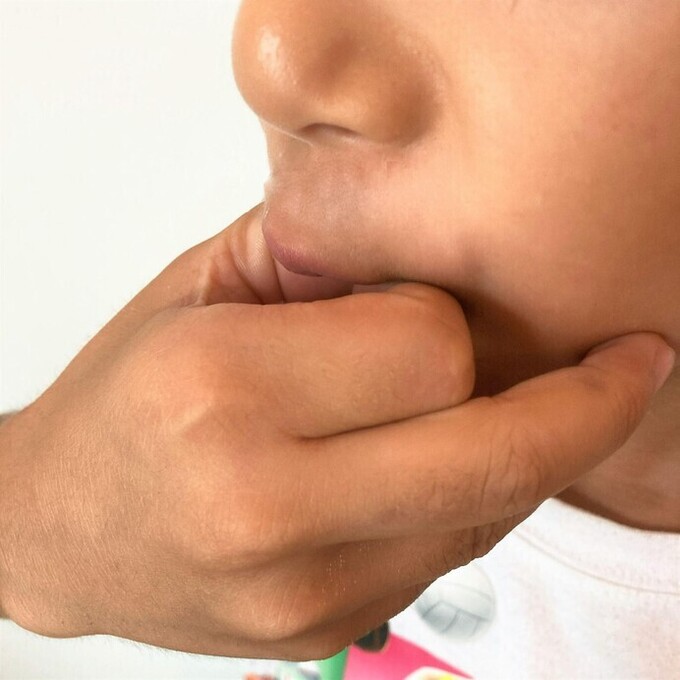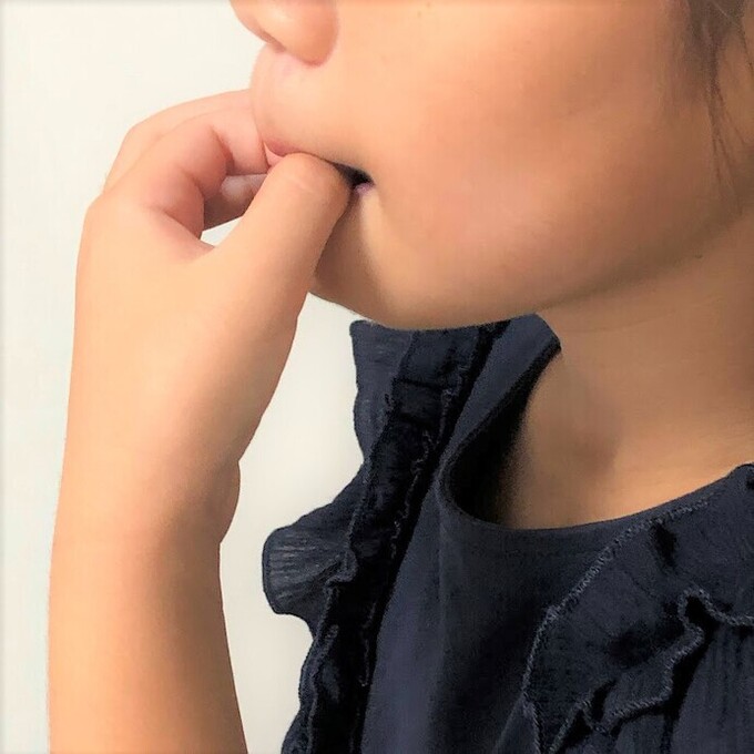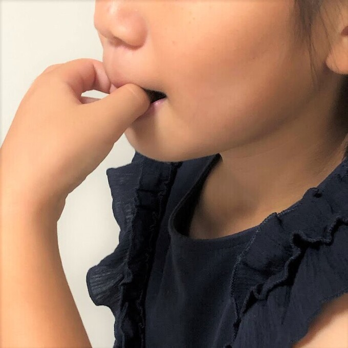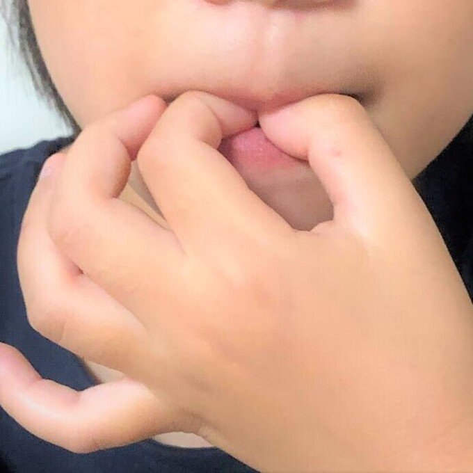 - 指を歯でかまないように唇を覆いつつ、口を閉じます(「ま」の発音をするイメージで)