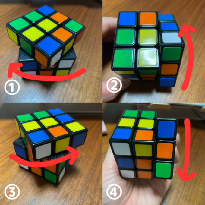 まずは青×橙×白の角が右側に来るように手に持って、(左、上、右、下)の順に回します。先ほどの白×青×橙が底面に白がくるまで何度も回します。