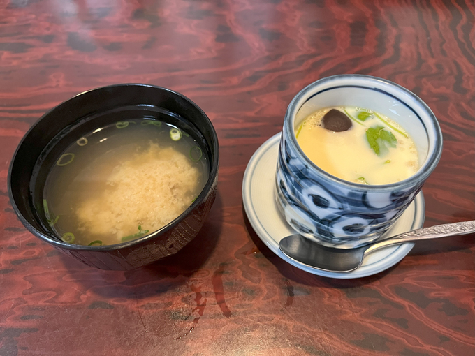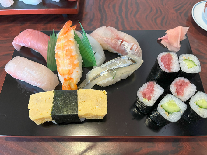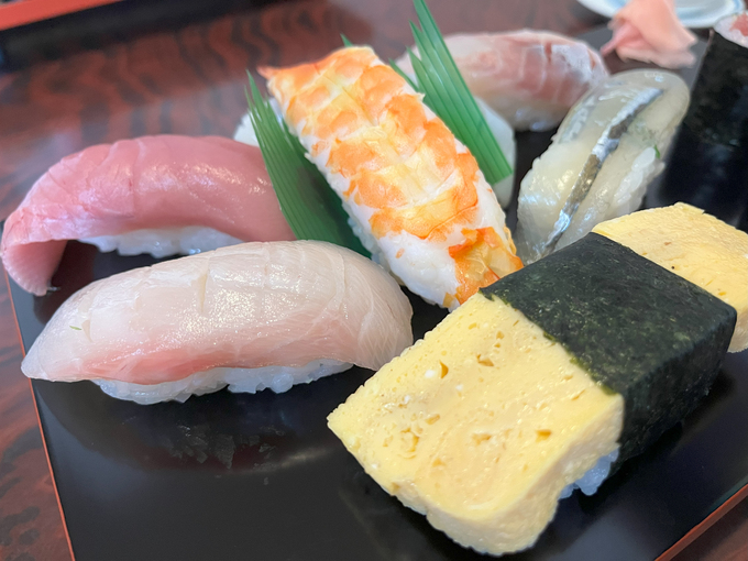 シャリが大きめのザ・町寿司。ネタも新鮮で大切りなので、ボリュームがあってかなり満足感があります!さらに茶碗蒸しとお椀までついてきました。