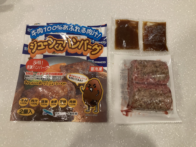 俵形の冷凍ハンバーグ2個とオニオンソースが入っています。