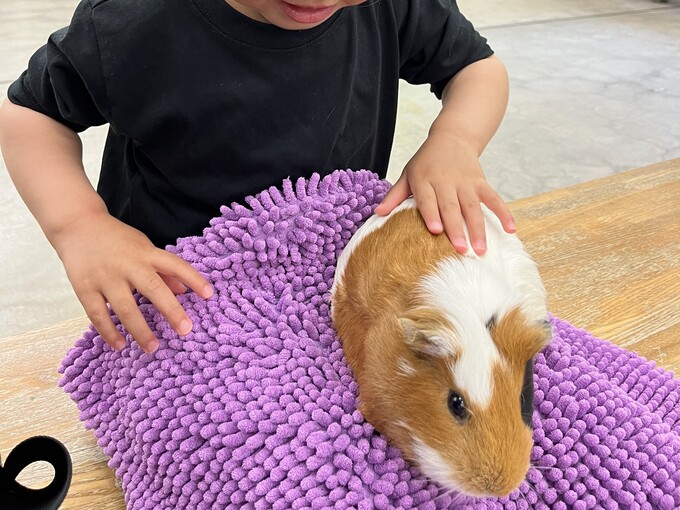 うさぎかモルモットを膝に乗せて触れ合うことができます。(無料です!)